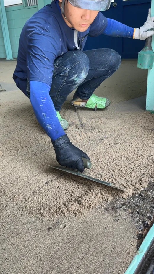 この工程では、コンクリートの凹凸や段差を埋め、滑らかな下地面を形成します。これにより、後工程の塗布材が均一に密着し、耐久性や美観を高めることができます。