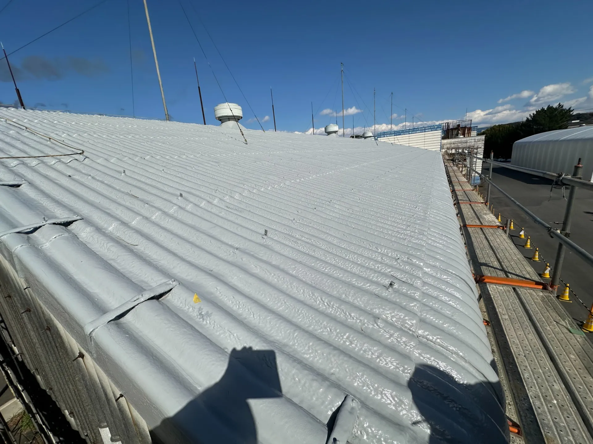 工場屋根や駐車場など雨漏り対策の防水工事を行います。ウレタン防水から FRP 防水・速硬化型スプレー防水・スレート屋根の